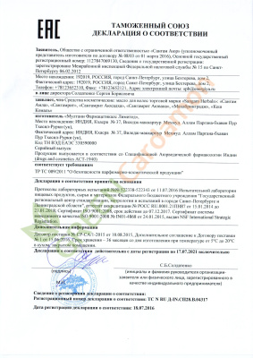 Состав: масло эмблики лекарственной, масло кунжута, эклипта альба, симплокоса кистевидного экстракт, куркума, ним, комплекс растительных масел (подсолнуха, хлопка, горчицы, кунжута, кукурузы, арахиса), минеральное масло, антиоксидантный компоненты ТВНQ, отдушка.